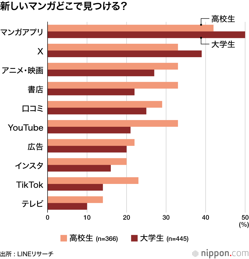 マンガを読む人が、「新作と出会う」のは高校生42%、大学生50%でいずれも「マンガアプリ」が最多。いまや、マンガもスマホで読む時代だが、高校生では「書店」も33%と意外と健闘。