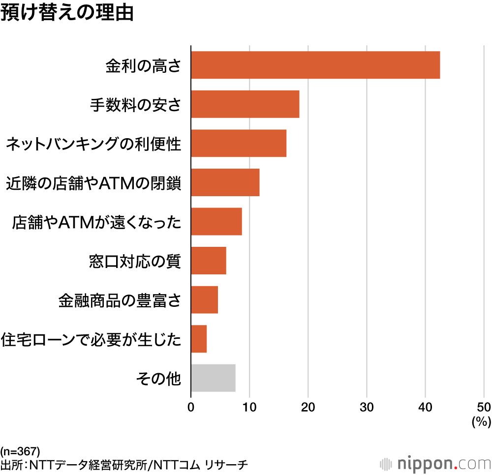 預け替えをした理由は「金利の高さ」42.5%がダントツ。長期にわたるマイナス金利政策のもとで鈍化していた消費者の金利感応度が、復活していることがうかがえる。