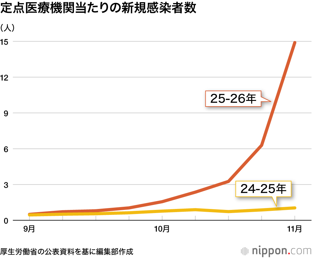 厚生労働省の集計で、全国3000の医療機関で10月27日~11月2日までの1週間に報告されたインフルエンザの新規感染者数が5万7424人に上った。1医療機関当たりの新規感染者数は前週の6.29人から2.37倍の14.90人となり、4週間以内に大流行が起きる可能性を示す注意報レベル(10人)を超えた。