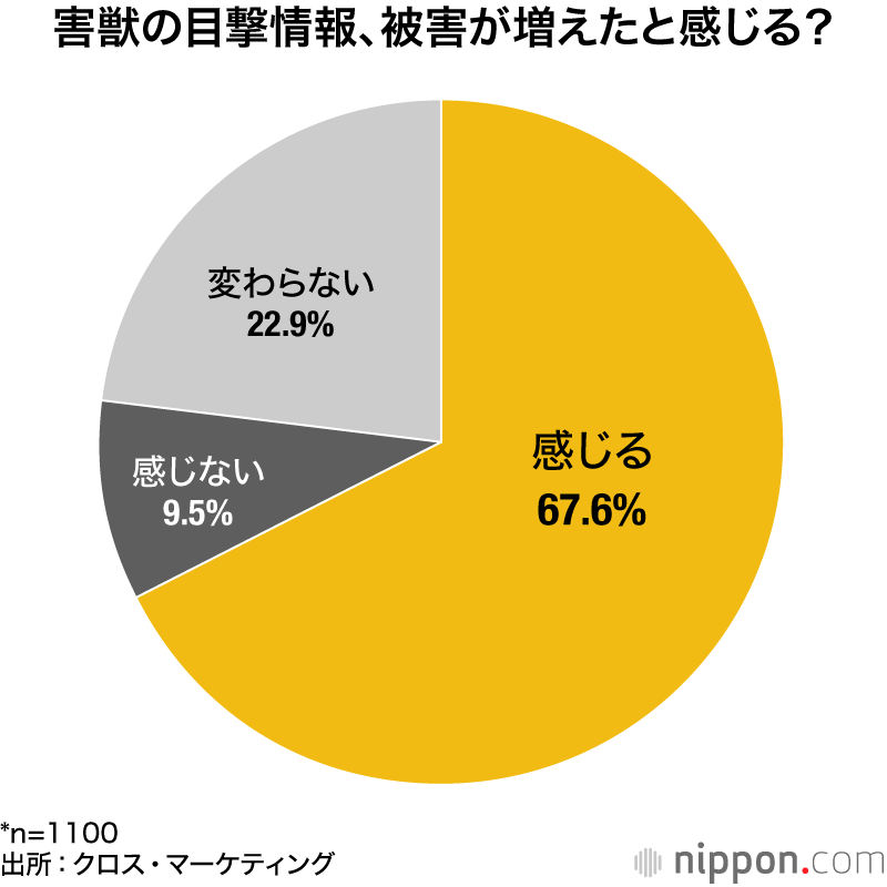 クマが人に危害を加える事態が多発している。クマをはじめとする害獣について意識調査したところ、目撃情報や被害が「増えた」と感じる人は67.6%に上った。