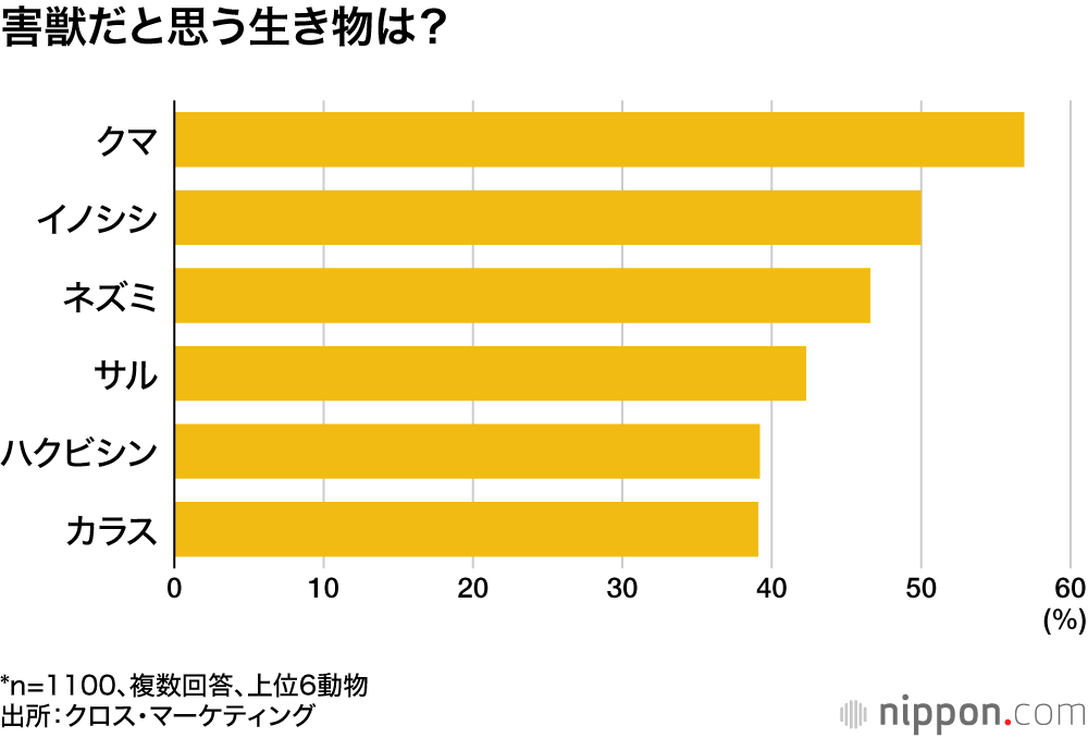 害獣だと思う動物を複数回答で問うと、クマが最も多く56.9%。イノシシ50.0%、ネズミ46.6%などが続いた。