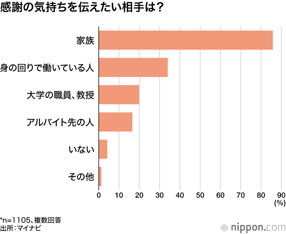 感謝を伝えたい相手(複数回答)は、家族が85.8%で最多となった。「身の回りで働いている人」が34.0%、「大学の職員、教授」が19.9%で続いた。