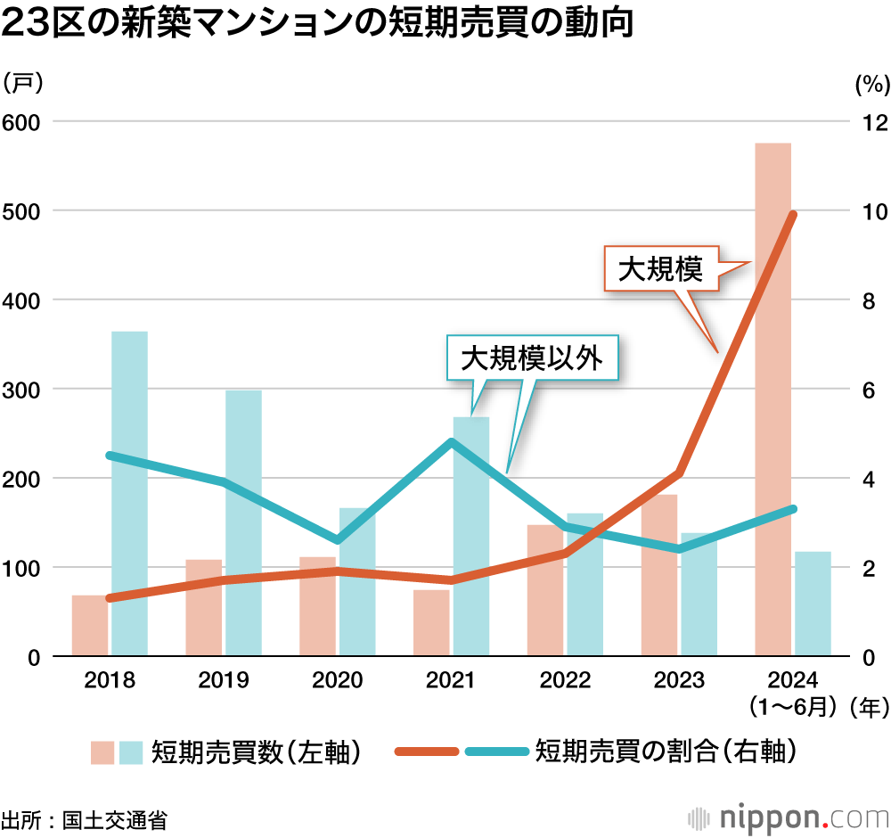 一方、2024年1~6月に登記された新築マンションのうち、1年以内に転売された割合は東京都8.5%、東京23区9.3%、都心6区12.2%で、短期売買も中心部ほど高い傾向にある。23区では24年に入って短期売買の割合が急増している。