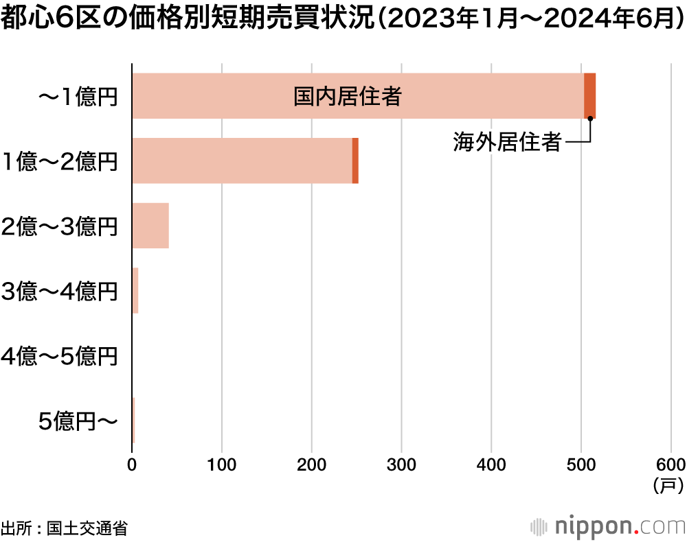 2023年1月~24年6月に短期売買された新築マンションは、大半が2億円未満の物件だった。短期売買全体に占める海外居住者の割合は3%未満で、2億円以上の物件については、海外居住者による短期売買はなかった。