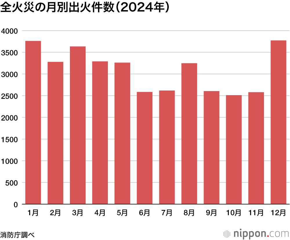 火災の多い月は12月、1月、3月、4月の順で、年末から発生件数がぐっと増えるのが見てとれる。冬とともに春先に火災が多いのは、空気の乾燥に加え、1年の中でも特に風が強い季節であることが理由だ。