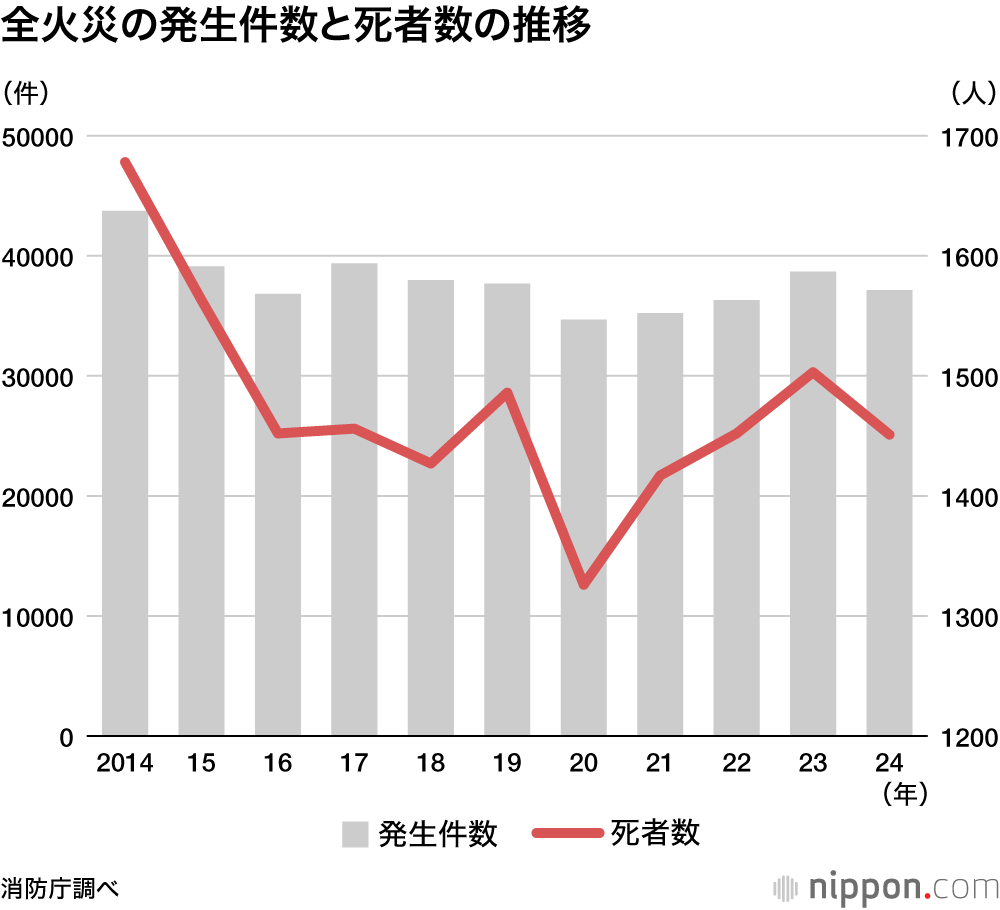 火災による死者、2024年は1451人:総出火件数は3万7141件―消防庁