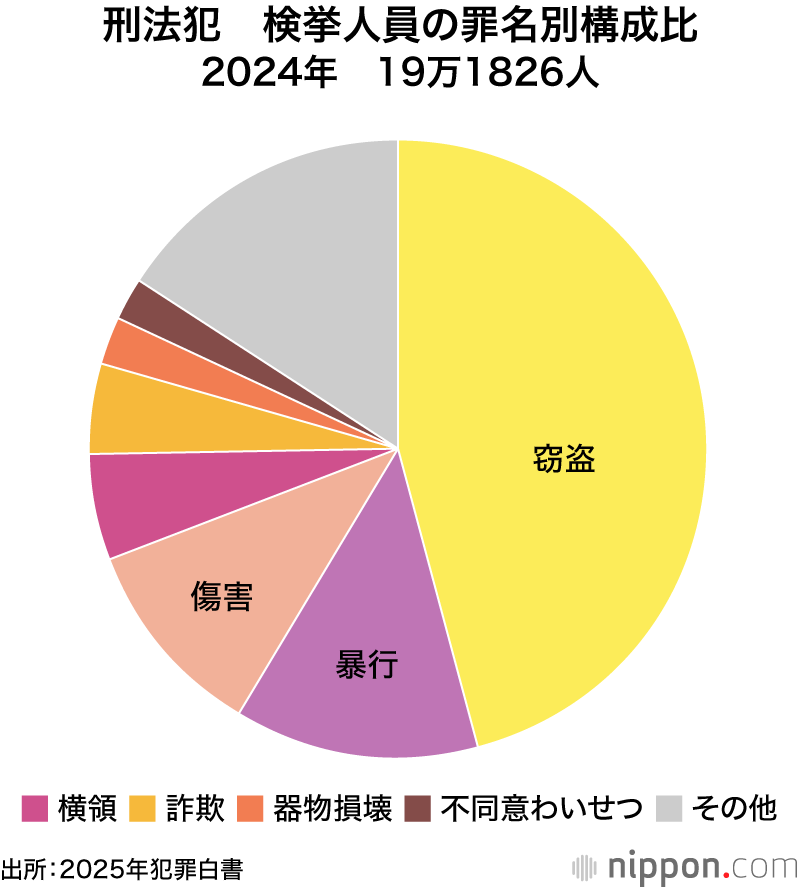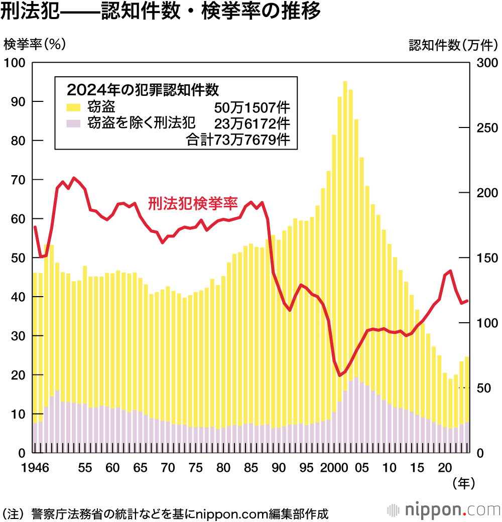 法務省が公表した2025年版犯罪白書によると、24年1年間の刑法犯認知件数は73万7679件と前年比3万件以上増加した。増加は3年連続。うち窃盗が50万1507件と、全体の7割近くを占めている。