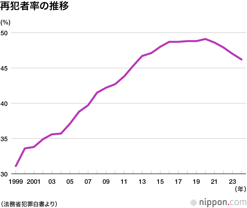 検挙者の総数は19万1826人。うち初犯者は10万3129人、再犯者は8万8697人だった。検挙者のうち再犯した人の割合を示す再犯者率は、前年より0.7ポイント低下して46.2%。再犯者率は近年一貫して増え続けていたが、21年から4年連続で減少した。