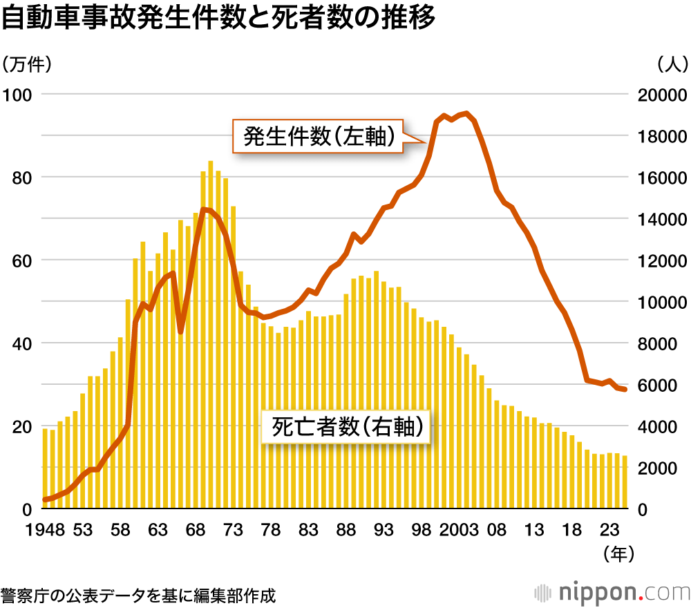 交通事故による死亡者数は、1950年代から60年代にかけて自動車の普及とともに増え、1970年に最多の1万6765人を記録。運転席・助手席のシートベルト着用が1992年に一般道で義務化されたほか、エアバッグの普及や、衝突被害軽減ブレーキなどのドライバーを支援する安全技術の進化を背景に、大きく減少した。