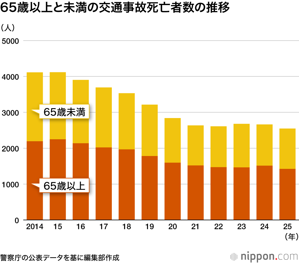 65歳以上の高齢者の死者数は前年より90人減の1423人。死者全体に占める割合は55.9%と高い水準が続いている。人口10万人当たりの高齢者の交通事故死者数は3.93人で、全国平均(2.06人)の約2倍となっている。