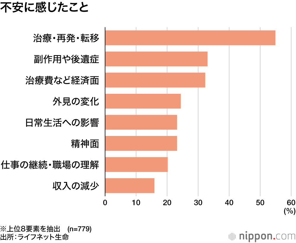 QOLを維持するにあたり感じた不安で最も多かったのは「治療・再発・転移」の54.9%で、「副作用や後遺症」「治療費など経済的な不安」「外見の変化」が続いた。