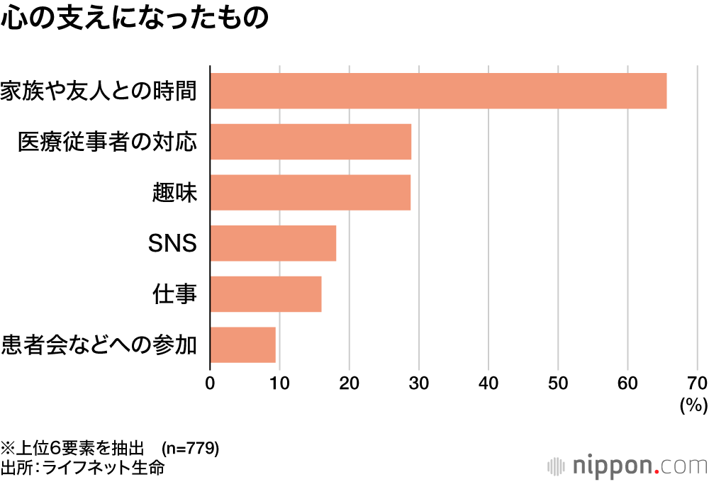治療中の心の支えは「家族や友人との時間」が65.6%と突出。「医療従事者の対応」「趣味」に助けられた人ももれぞれ3割近くに上った。