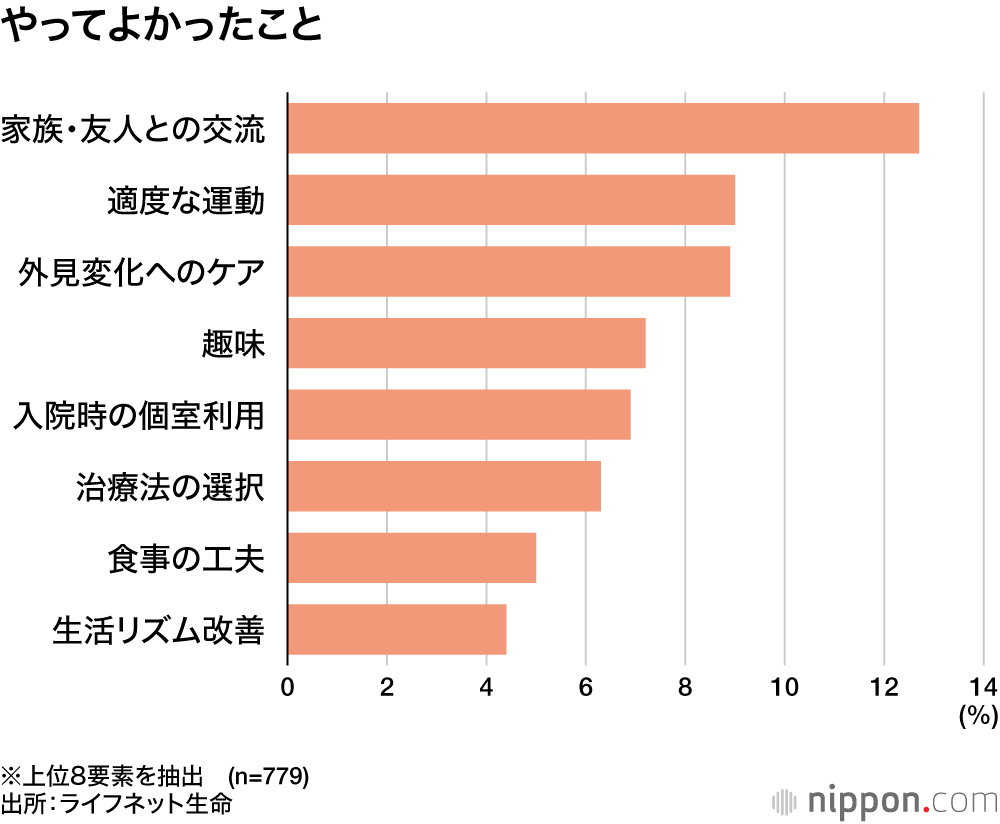QOL維持のために良かったことは「家族・友人との交流」12.7%がトップで、「適度な運動」「外見変化へのケア」「趣味」の順だった。なお、若年層(20-30代)に絞ると、「外見変化へのケア」が21%でトップだった。
