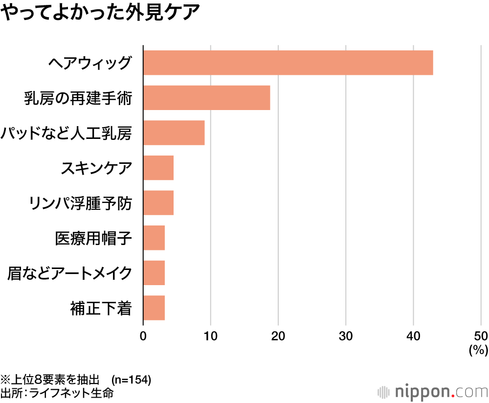 乳がんの治療における外見の変化には個人差があるが、乳房の変形・消失のほか、脱毛やむくみなどが生じる場合がある。こうした変化に対し何らかの処置を施した154人に、やって良かったケアを聞いたところ、「ヘアウィッグ」42.9%が圧倒的なトップ。以下、「乳房の再建手術」18.8%、「パッドなど人工乳房」9.1%と続いた。