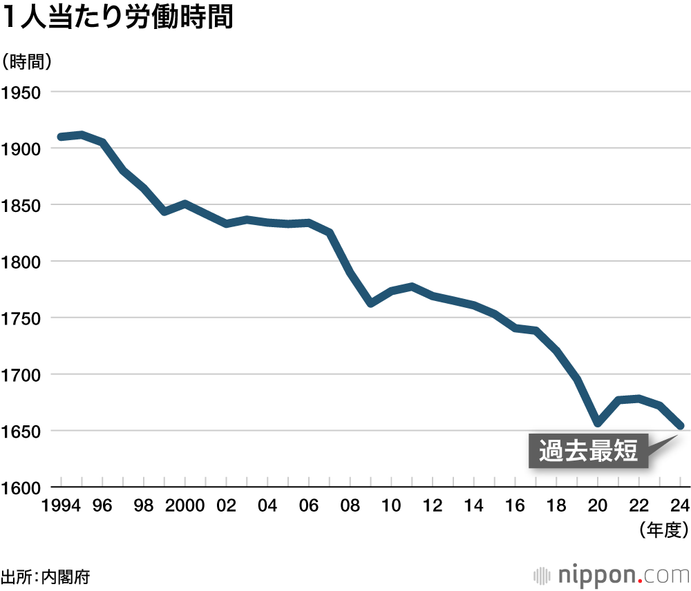2024年度の雇用者1人当たりの労働時間は1654.2時間で、比較ができる1994年度以降で最も短くなった。