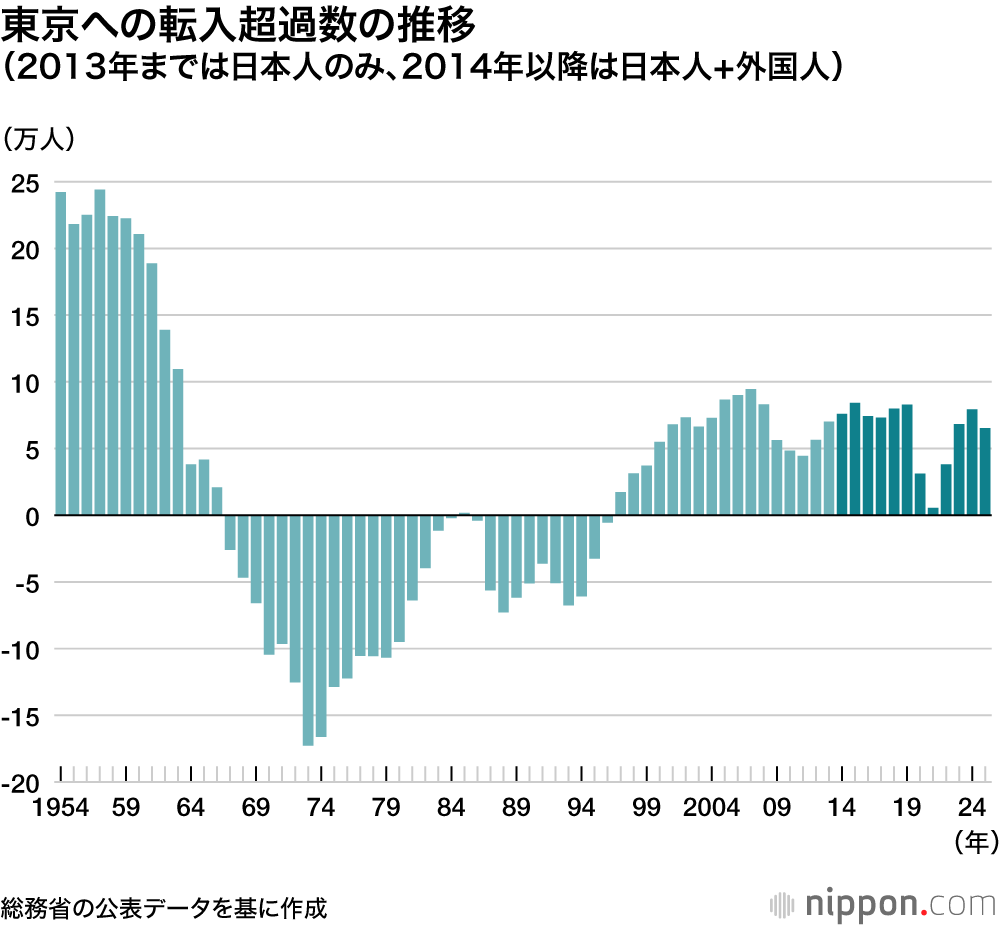 総務省が公表した2025年の住民基本台帳に基づく人口移動報告によると、「東京都への転入者数」と「東京都からの転出者数」は差し引き6万5219人の転入超過だった。超過数は24年よりも1万4000人余り減少した。減少は4年ぶり。外国人が前年8722人の転入超過から、378人の転出超過に転じた。