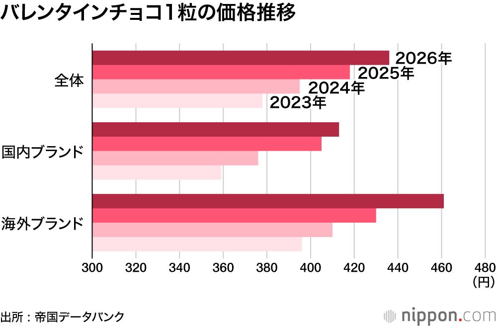帝国データバンクが全国の大手百貨店やショッピングモールなどに出店する計155ブランドの2026年バレンタイン向けチョコレートの調査で、1粒当たりの平均価格は前年より18円アップの436円だった。フランスやベルギーなど人気の輸入ブランドは31円アップの461円。国内ブランドも同8円アップの413円で、過去最高値となった。