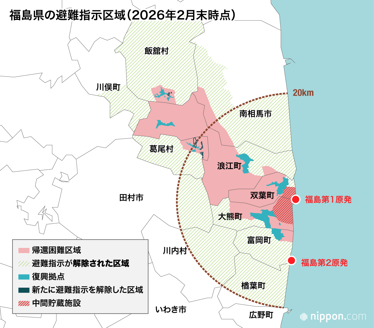 福島第1原発事故による放射線物質の放出・拡散により、原発周辺の7市町村の一部が現在も避難指示区域(帰還困難地域)に指定されている。福島県によると、2025年12月現在、約309平方キロ。この1年で、飯舘村の堆肥製造施設用地と外縁部の農地、葛尾村の風力発電所用地の計26ヘクタールが新たに避難指示区域から外れた。