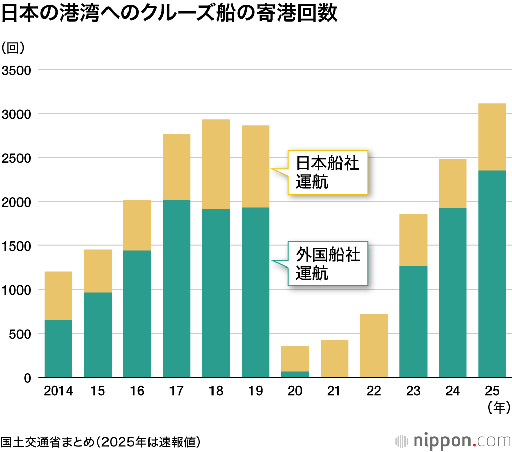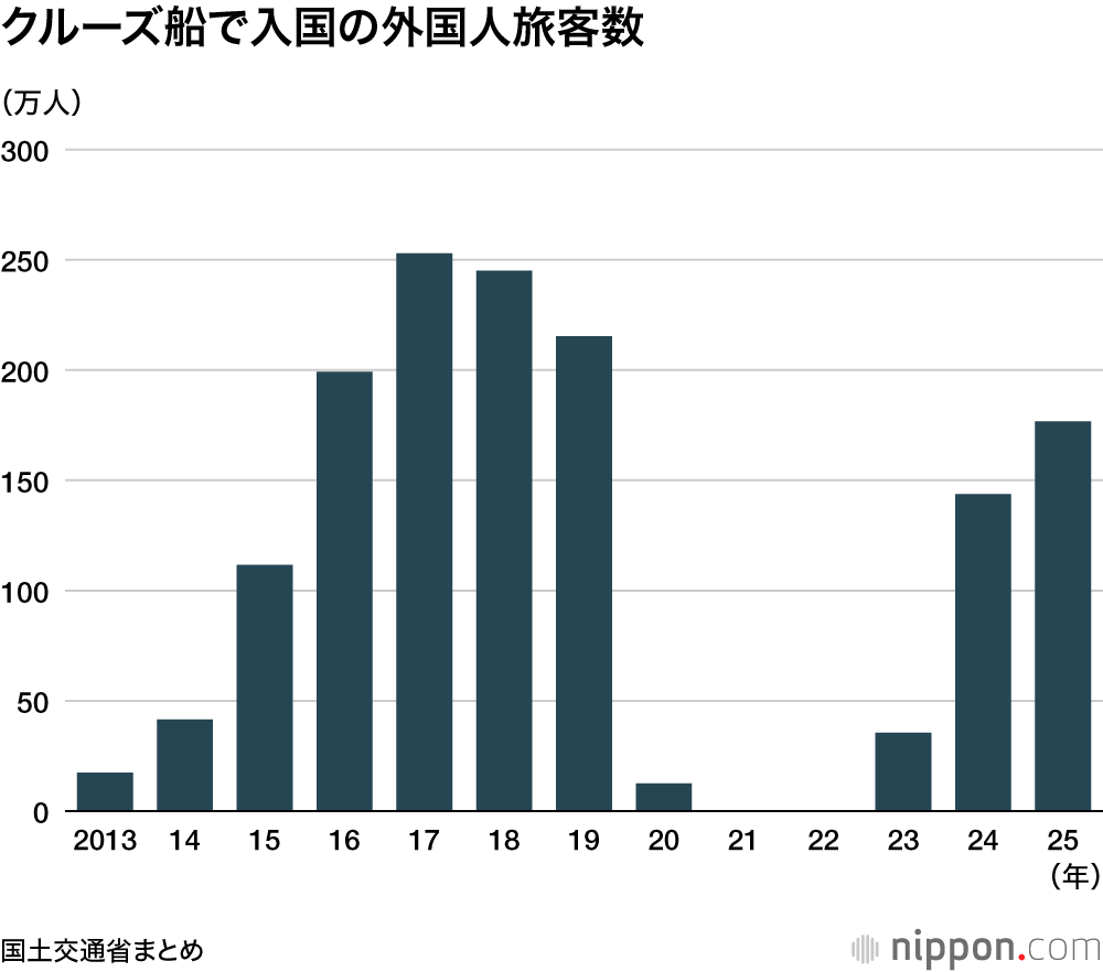 政府はクルーズ再興に向けた25年の目標として、「訪日クルーズ旅客250万人」「外国クルーズ船の寄港回数2000回超」を掲げていたが、旅客数は目標に達しなかった。