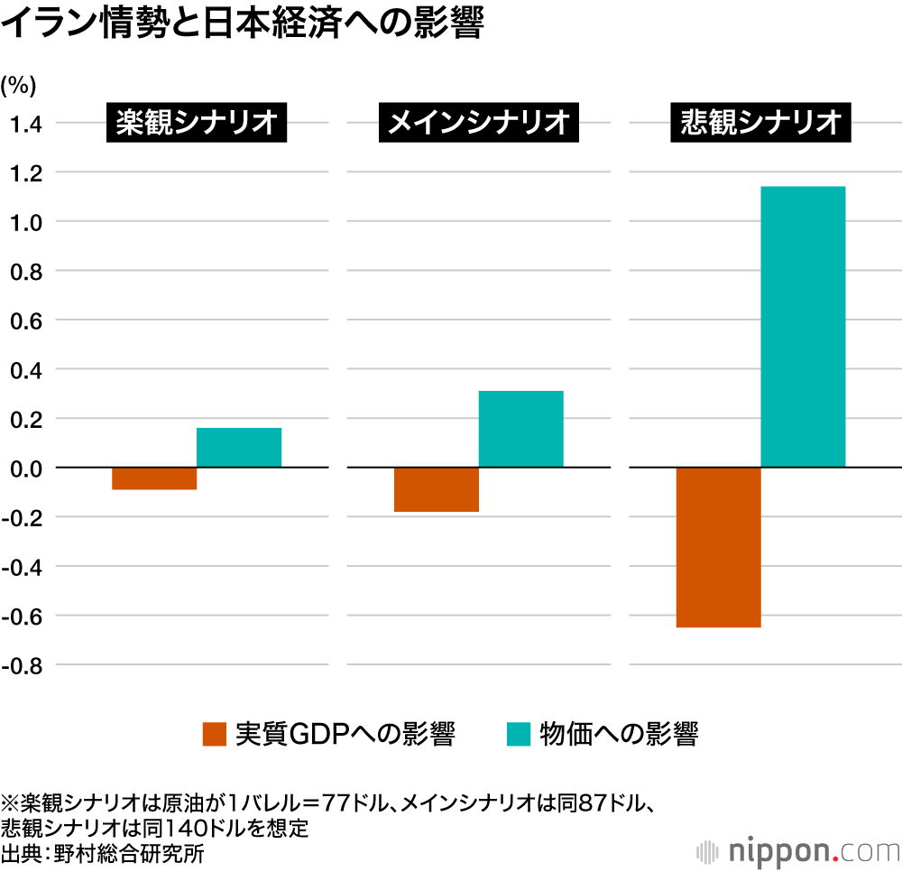 その場合、原油価格は1バレル=87ドルまで上昇し、日本の実質国内総生産(GDP)は0.18%押し下げられ、物価は0.31%押し上げられる。電気・ガス代の上昇が輸送や製造のコストを引き上げ、沈静化の兆しを見せていた物価上昇が再燃するなど「国民生活に逆風となる」とみている。