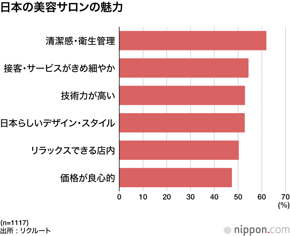 日本の美容サロンの魅力は、「清潔感・衛生管理」61.9%が最も高く、「接客・サービス」54.4%、「技術力が高い」52.9%も半数を超えた。