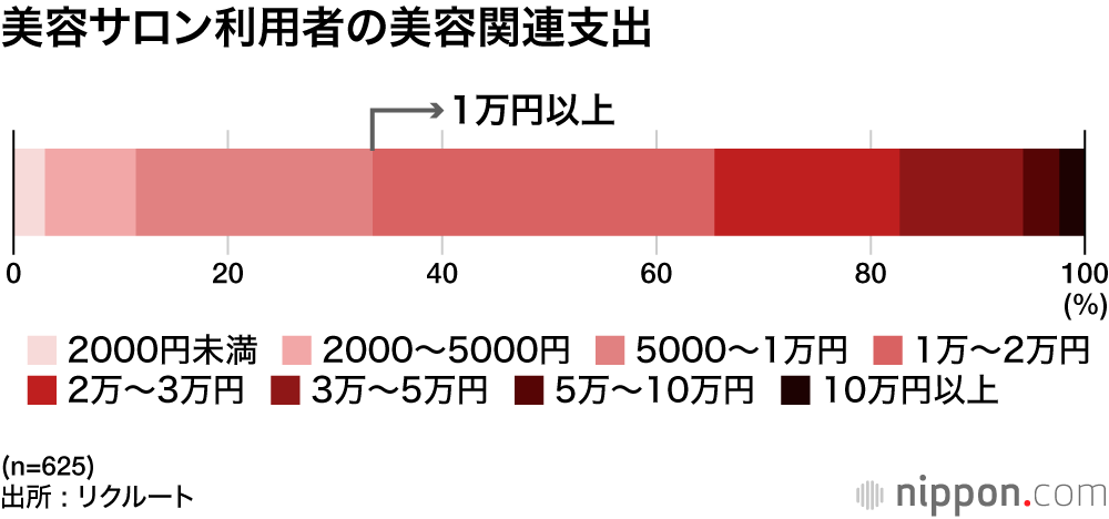 美容サロン利用者の66.5%は美容関連に(コスメ購入など含む)1万円以上の支出をしており、平均額は2万630円だった。