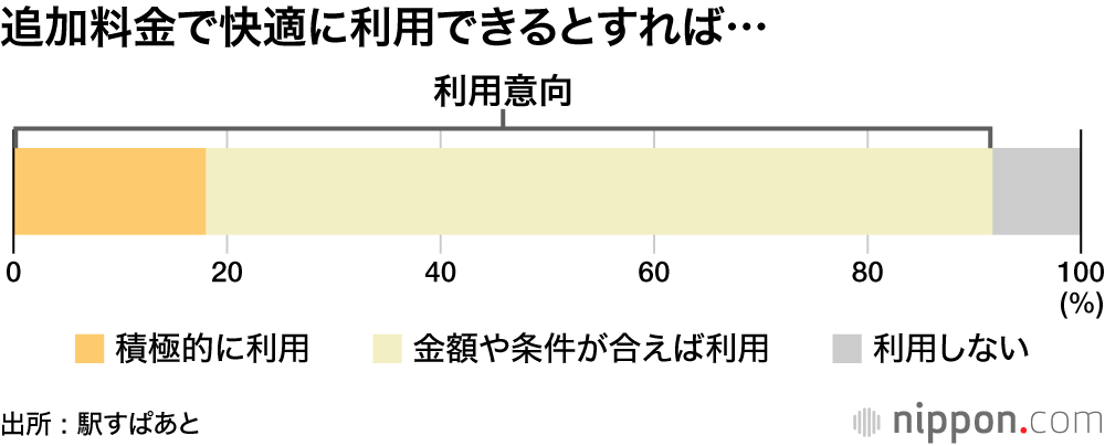 運賃に追加料金で、混雑回避や座席グレードアップできるサービスを、「積極的に利用したい」は18.0%。「金額や条件が合えば利用したい」も含めると、9割以上の人が快適な移動サービスのための「プラスα」の支出に前向きだった。
