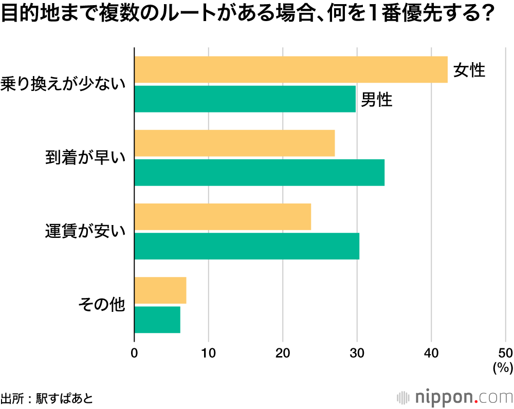 移動経路を選択する際にタイパ・コスパと共に考慮されるのが「乗り換えの回数」。目的地まで複数のルートがある場合、何を1番に優先するかについては、女性は「乗り換えが少ない」42.2%がトップだったのに対して、男性は「到着の早さ」33.7%と男女差がくっきり。女性は「シンプルで早いルート」、男性は「早くて安いルート」を選ぶ傾向があるようだ。