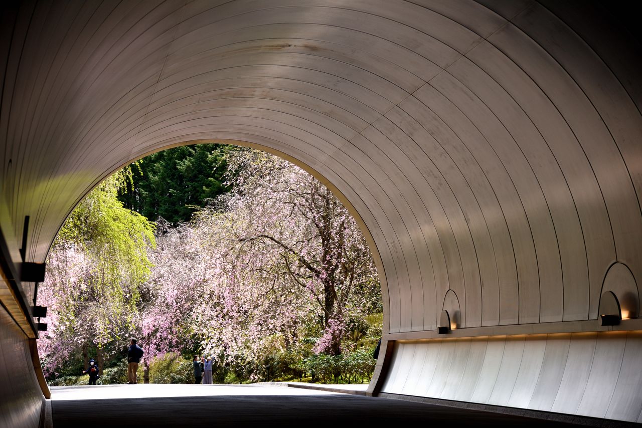ルーヴル美術館のガラスのピラミッドで知られる建築家I.M.ペイ氏が、「桃源郷」をイメージして設計した美術館。レセプション棟から美術館に向かうアプローチがしだれ桜の並木道となっている。ほのかに桜色に染まったトンネル越しの桜が人気。見頃:例年4月上旬~中旬