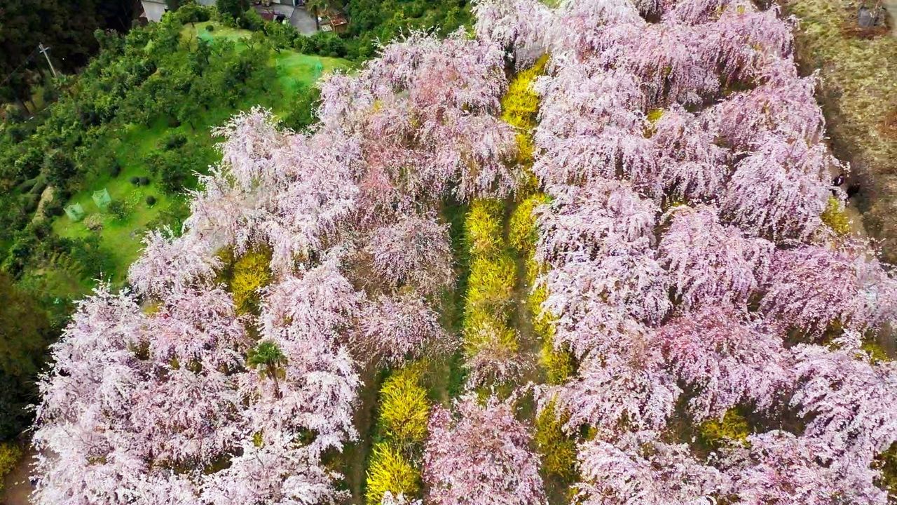 山一面が300本以上のしだれ桜とレンギョウに覆われ、ピンクと黄色のコントラストが美しい。