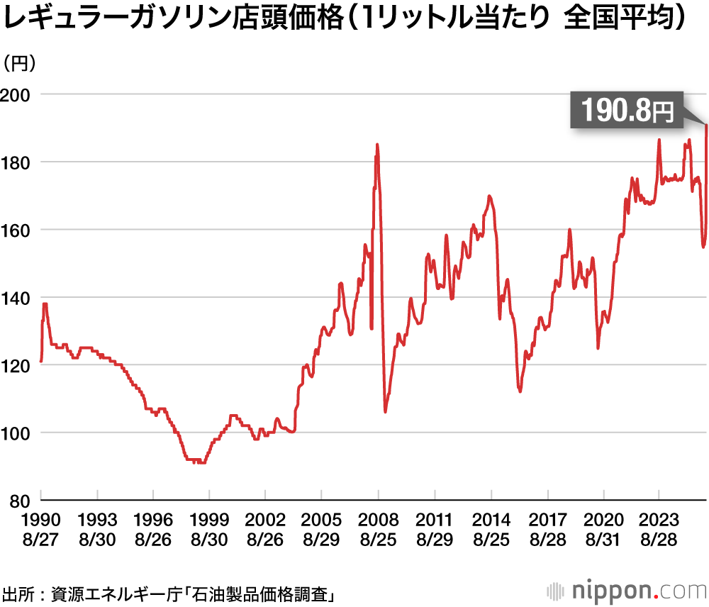 経済産業省が3月18日発表したレギュラーガソリン1リットル当たりの全国平均小売価格(16日時点)は前週から29円の急騰となり、190円80銭と最高値を更新した。