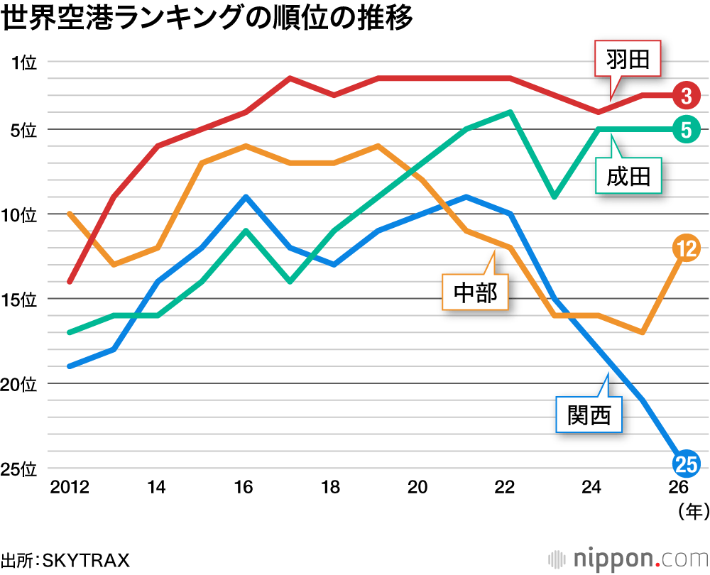 英SKYTRAX社が発表した「World Airport Awards 2026」の総合ランキングで、羽田空港は前年と同じ3位だった。成田空港は5位、中部国際空港12位。関西国際空港は25位に順位を下げた。
