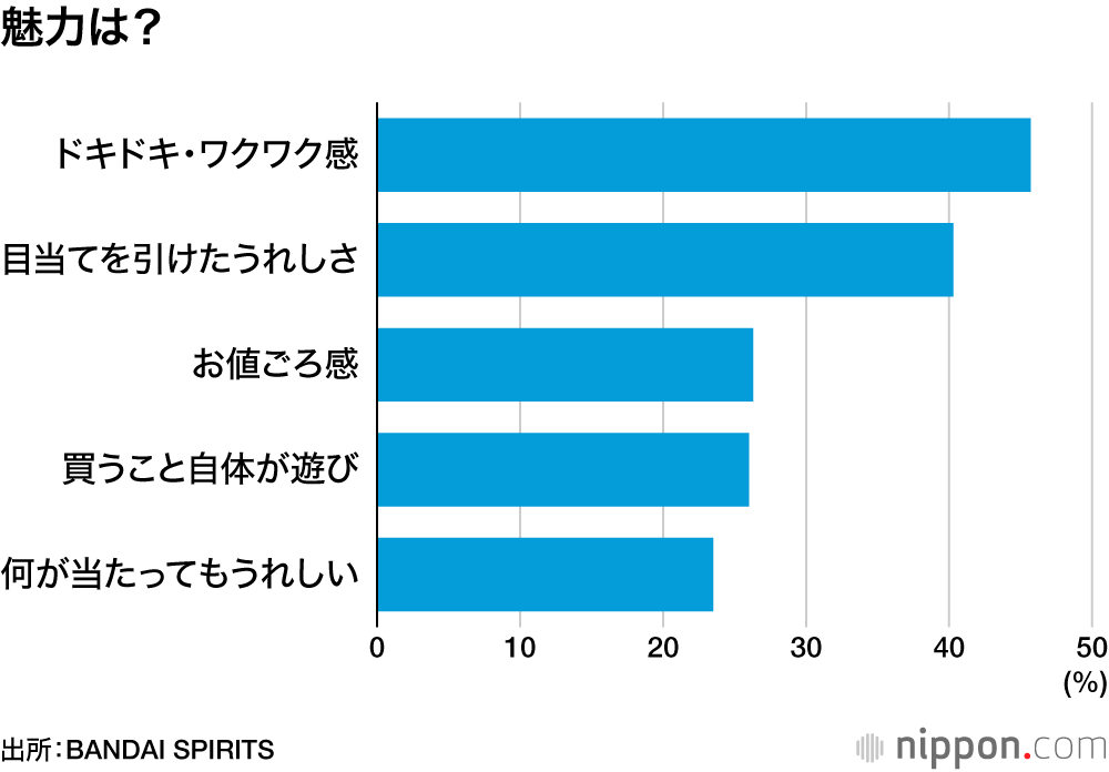 ランダムグッズの魅力は、なんといっても「ドキドキ・ワクワク感」45.7%。次いで「目当てを引けたときのうれしさ」40.3%。「お値ごろ感」26.3%、「買うこと自体が遊び」26.0%と続いた。「何が当たってもうれしい」という寛容な人も23.5%いて、グッズの入手自体に加え、体験として得られる“感情”が大きな魅力のようだ。