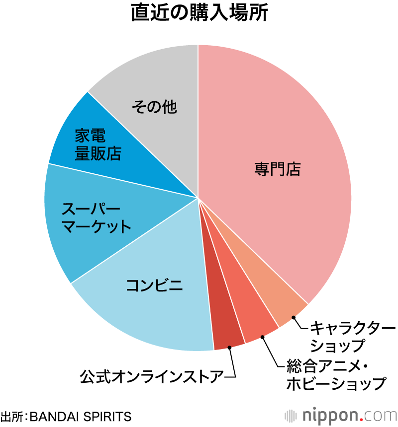 最も多い購入場所は「専門店」で、オタク要素が比較的強い「キャラクターショップ」「総合アニメ・ホピ―ショップ」「公式オンラインストア」を合わせると、全体の5割近くを占めた。かたや「コンビニ」「スーパー」「家電量販店」の合計は4割。この結果からも、目的意識を持って買い求める層と、立ち寄った先で気軽に試す層に分かれていることが見て取れる。