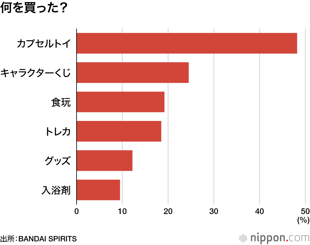 実際に購入したランダムグッズは、「カプセルトイ」が断トツ。以降、「キャラクターくじ」、菓子とおもちゃがセットになった「食玩」、中身が見えない仕様の「トレーディングカード(トレカ)」や「グッズ」、溶けると中から景品が出てくる「入浴剤」の順だった。