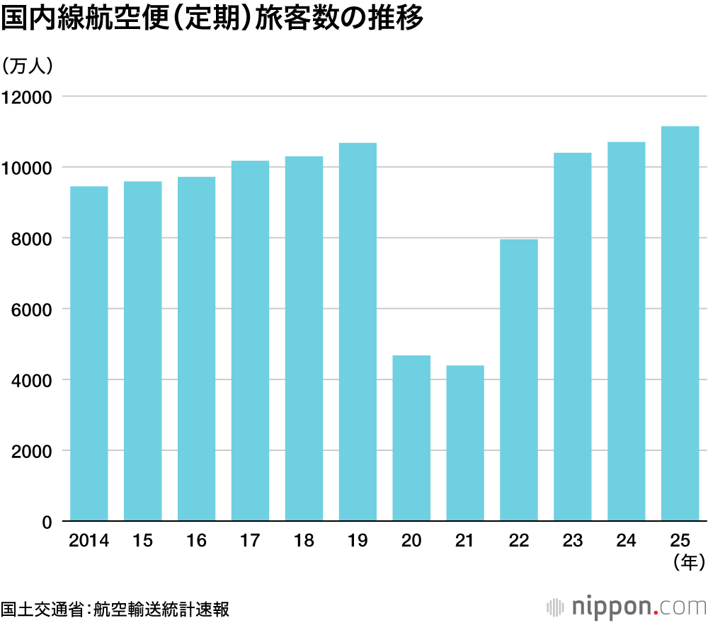 国土交通省がこのほど公表した航空輸送統計速報(2025年分)によると、25年に国内線定期便を利用した旅客は前年比4.2%増の1億1147万人だった。