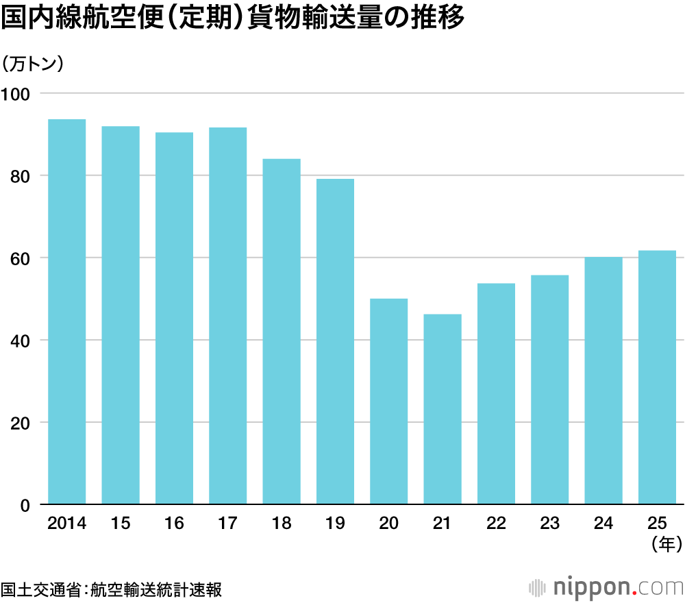 コロナ禍前の2019年の国内線旅客数は1億667万人で、2年連続でこの数字を上回った。一方、貨物量は年80万トンから90万トンあったコロナ禍前と比べ、7割程度にとどまっている。