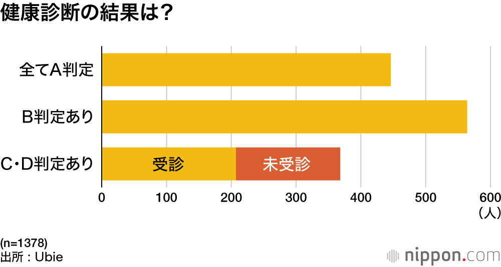 テクノロジーを駆使した医療関連サービスを提供するUbie(東京都中央区)の調査で、この数年で健康診断を受診した1378人のうち、すべての項目が「A判定=異常なし」は446人(32%)にとどまり、「B判定=軽度異常・要経過観察等」が564人(41%)、「C~D判定=要再検査・要加療等」368人(27%)に上った。