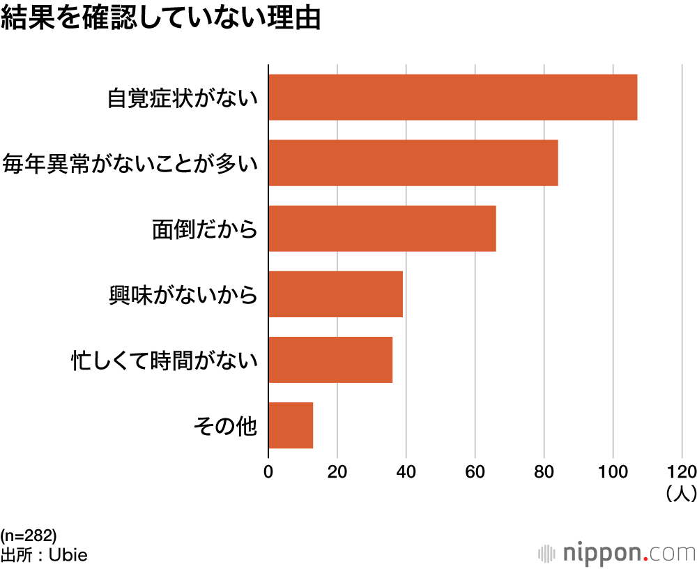 結果を十分に確認しなかった理由としては、「自覚症状がない」107人が最多で、「毎年異常がないことが多い」84人、「面倒だから」66人が続いた。本来、異常を早期発見、早期治療につなげることが健診の目的だが、自覚症状で判断するなら、受ける意味がない。