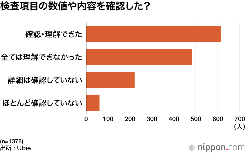 健診結果について、「各項目の数値を確認し理解できた」人は半数以下の614人。「確認したが全ては理解できなかった」482人、さらに2割に相当する282人は詳細を確認すらしていなかった。
