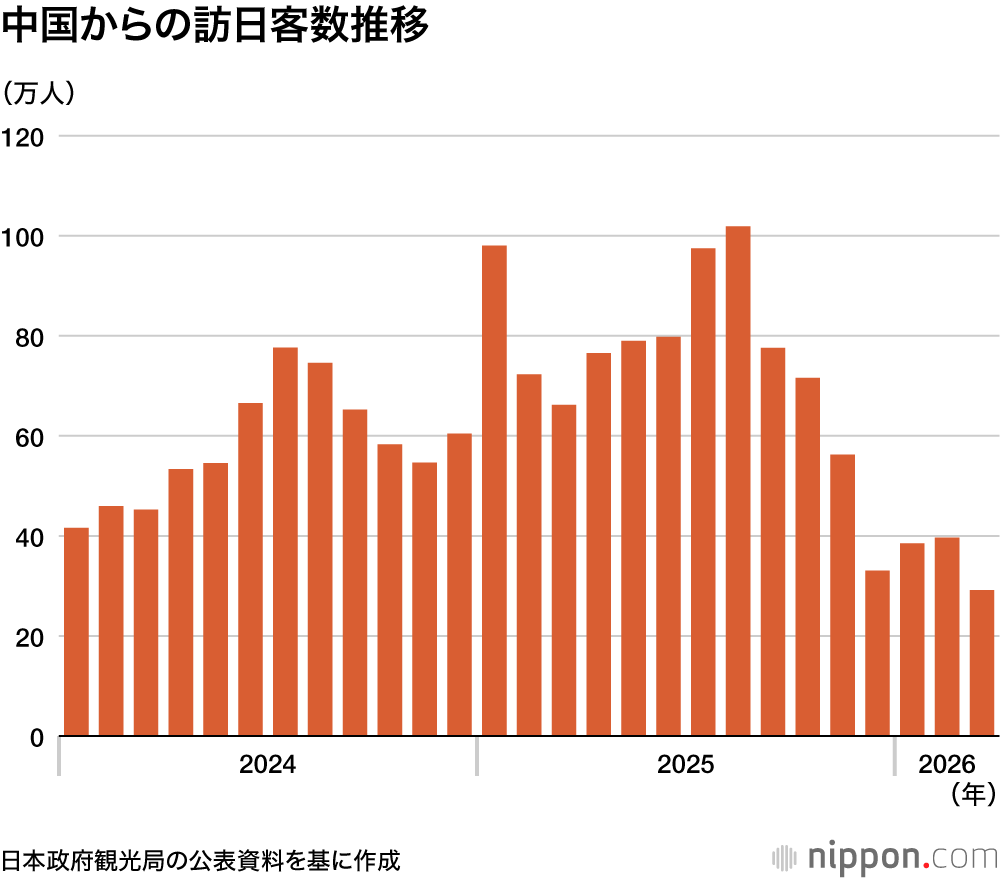 一方、昨年11月の高市早苗首相の台湾有事発言を契機に、訪日自粛ムードが強まっている中国は55.9%減の29万1600人と4カ月連続で前年水準を下回った。中東情勢の悪化による航空便の運休・減便の影響で中東も同30.6%減と大幅なマイナス。