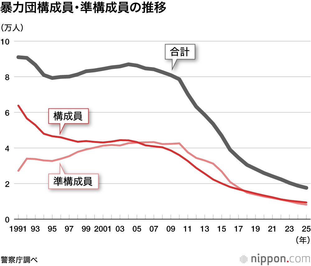 警察庁がこのほど公表した「組織犯罪の情勢」報告書によると、全国の暴力団構成員や準構成員らの2025年末時点の人数は、前年比1200人減の1万7600人。21年連続で減少し、過去最少を更新した。構成員は同500人減の9400人となった。