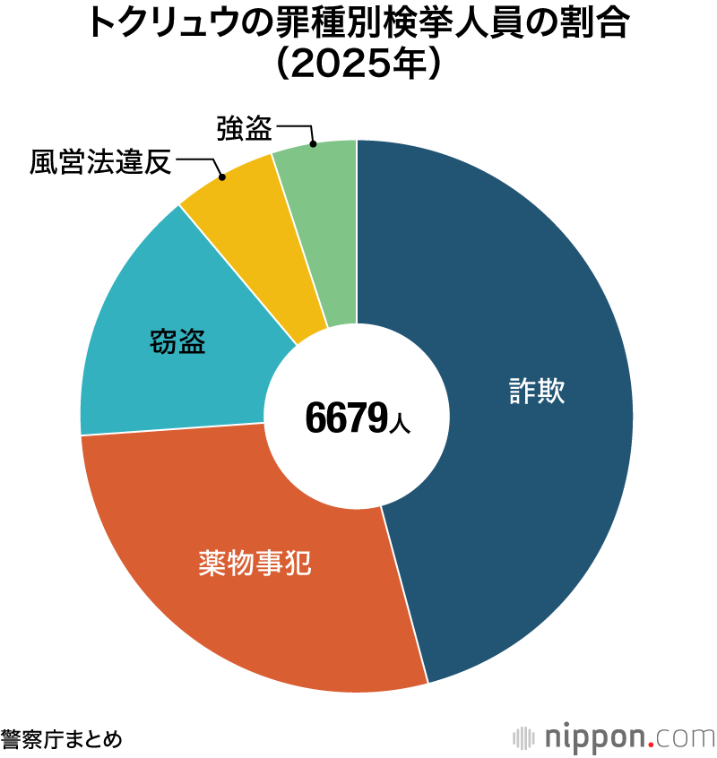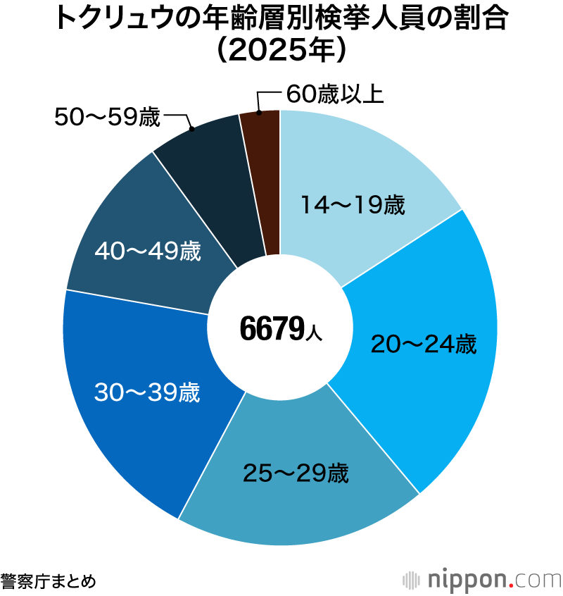 トクリュウによるものとみられる犯罪に関わる2025年の検挙人員は6679人(前年比1476人)。犯罪別・年齢別の内訳は下図の通りで、詐欺と薬物事犯で大半の資金を獲得している。