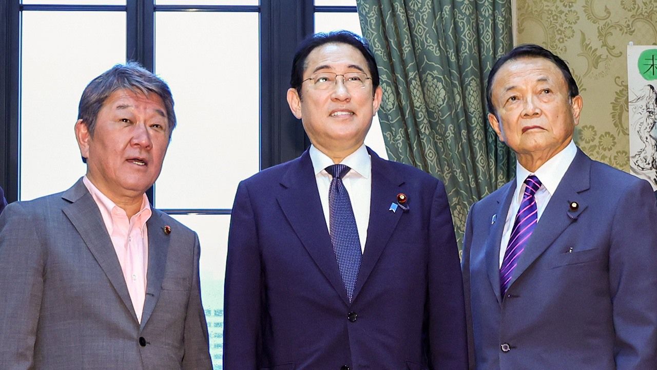 バナー写真:通常国会が閉幕し、自民党を訪れた岸田文雄首相(中央、同党総裁)。同左は茂木敏充幹事長、同右は麻生太郎副総裁=6月21日午後、国会内(時事)