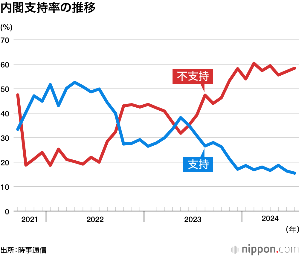 対面調査の時事通信は6月を0.9ポイント下回る15.5%で、2012年12月に自民党が政権復帰してからの最低値を2カ月連続で更新した。