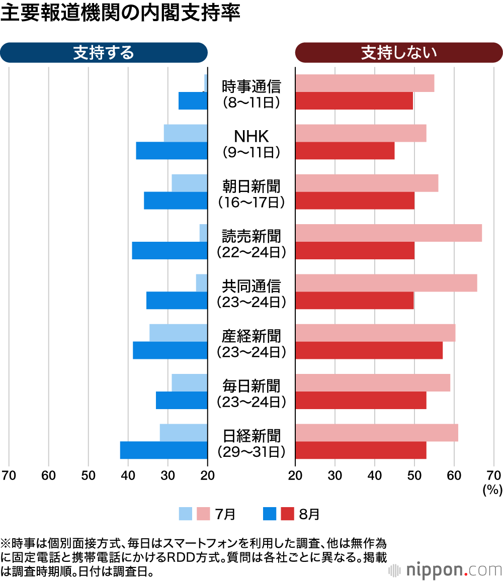 7月と比較して最も支持率が上昇したのは読売新聞で、17ポイント増の39%だった。共同通信も12.5ポイント増えて35.4%となった。変動幅が最小だったのは毎日新聞で増加は4ポイントだった。日経新聞は2月以来半年ぶりに4割台を回復、毎日も半年ぶりに3割台を回復したと伝えている。