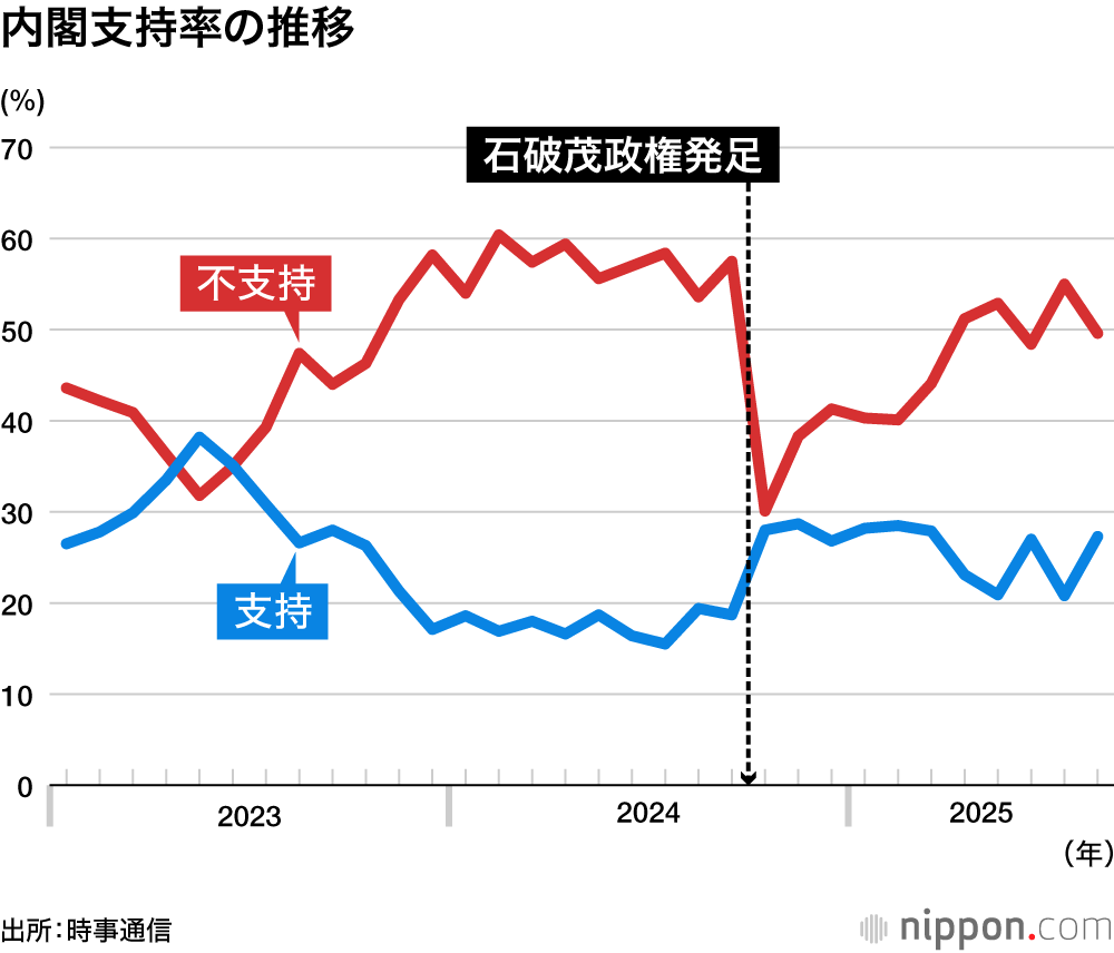 自民党内では参院選の敗北後、首相に引責辞任を求める「石破降ろし」が続いているが、日経の調査では「直ちに首相交代」を求めた回答が前月の36%から32%に減少し、他の7社の調査では「辞任すべきだとは思わない」といった続投容認派が、「辞任すべき」などの早期交代派を上回った。