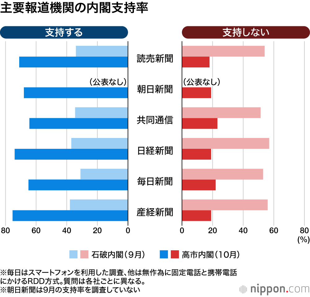 各結果は高市氏が首相に選出された10月21日以降、28日までに公表されたもの。支持率の最高値は産経の75.4%、最低値は共同通信の64.4%だった。