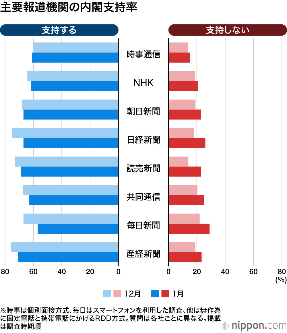 支持率7割台は12月時点では8社のうち3社あったが、1月は1社に減少。6割台は4社から6社に増えた。