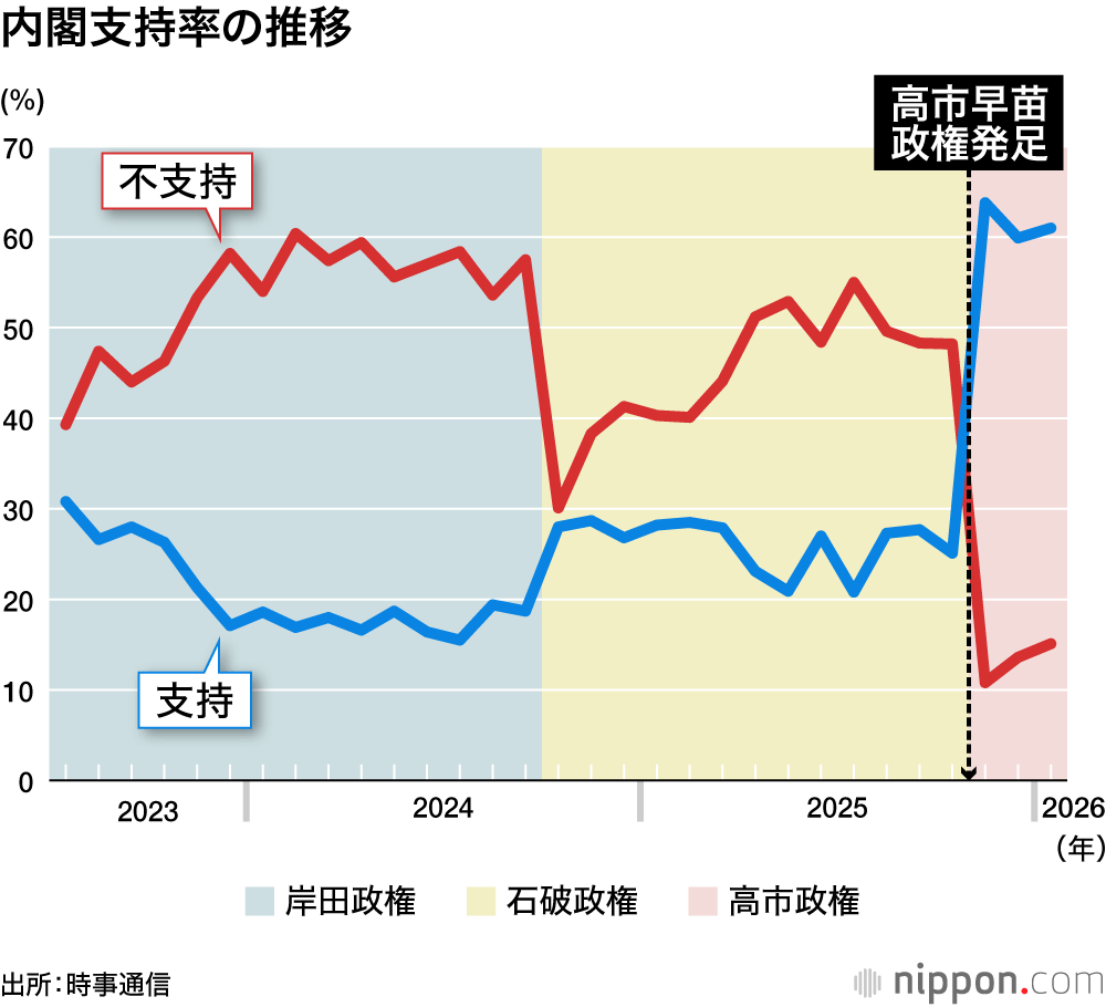 【高市内閣の支持率】7社下落 中心は6割台に 「解散判断は評価せず」多数─1月の報道8社世論調査